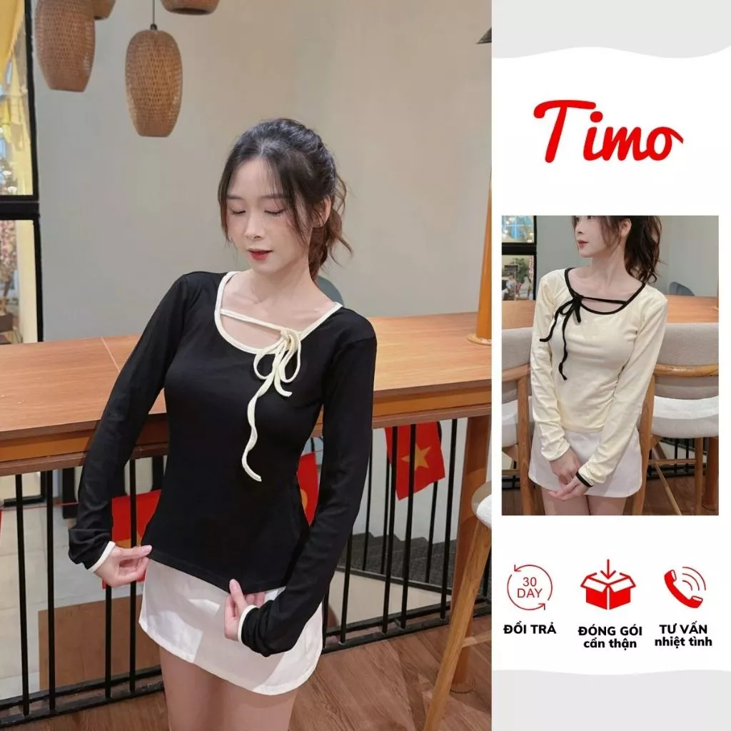 🔥 Áo thun nữ dài tay cổ cut-out phối nơ, áo kiểu dáng ôm phong cách Hàn Quốc AOT064 đang giảm giá!